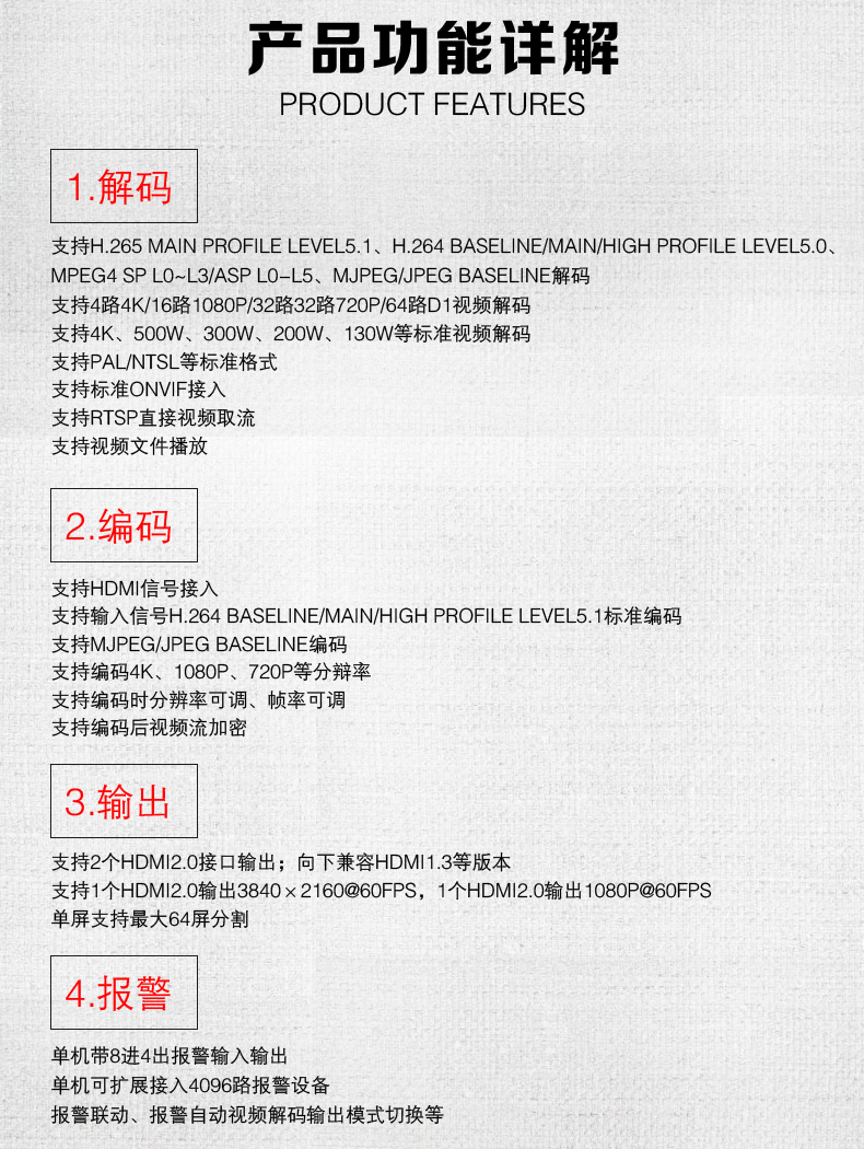 支持4路4K/16路1080P/32路32路720P/64路D1視頻解碼;