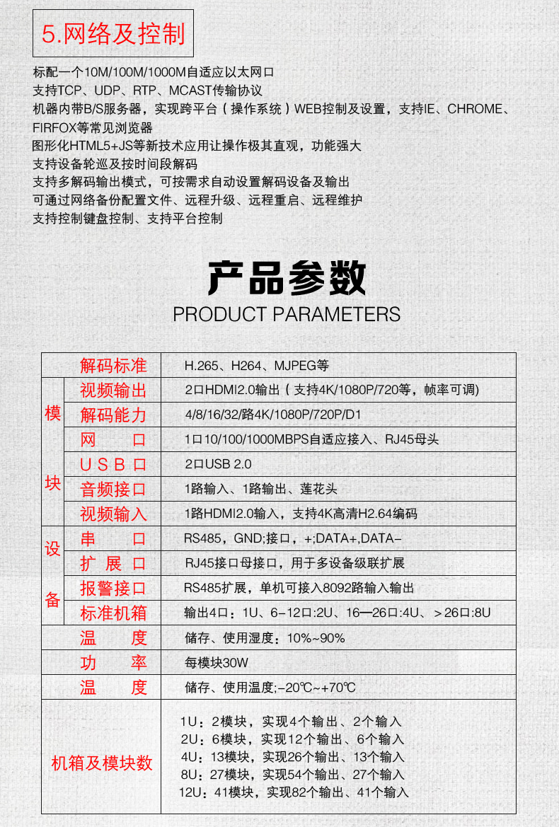 網(wǎng)絡(luò)數(shù)字解碼矩陣切換器采用最新的安防專用編解碼芯片,專為H.265標(biāo)準(zhǔn)及4K超高清編解碼而設(shè)計(jì),產(chǎn)品采用嵌入式LINUX架構(gòu),保障系統(tǒng)的穩(wěn)定運(yùn)行,采用模塊化設(shè)計(jì),可以在大型、超大型數(shù)字安防監(jiān)控系統(tǒng)中實(shí)現(xiàn)解碼、編碼、拼接、分割、畫中畫、漫游等功能,為工程項(xiàng)目最大程序解決大數(shù)據(jù)數(shù)字化監(jiān)控系統(tǒng)提供解碼上墻及多信號(hào)輸入編碼等提供一站式解決方案;設(shè)備采用全鋁標(biāo)準(zhǔn)機(jī)箱,結(jié)構(gòu)上大氣美觀可靠,散熱性結(jié)構(gòu)化好。