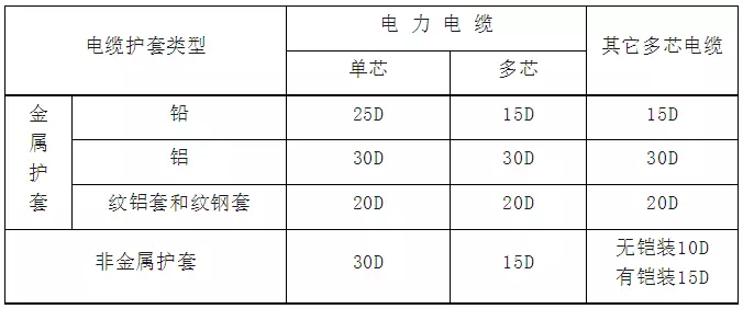 無鎧裝電纜,應不低于電纜外徑的6D;鎧裝或銅帶屏蔽電纜,應不低于電纜外徑的12D;屏蔽軟電纜,就不低于電纜外徑的6D。